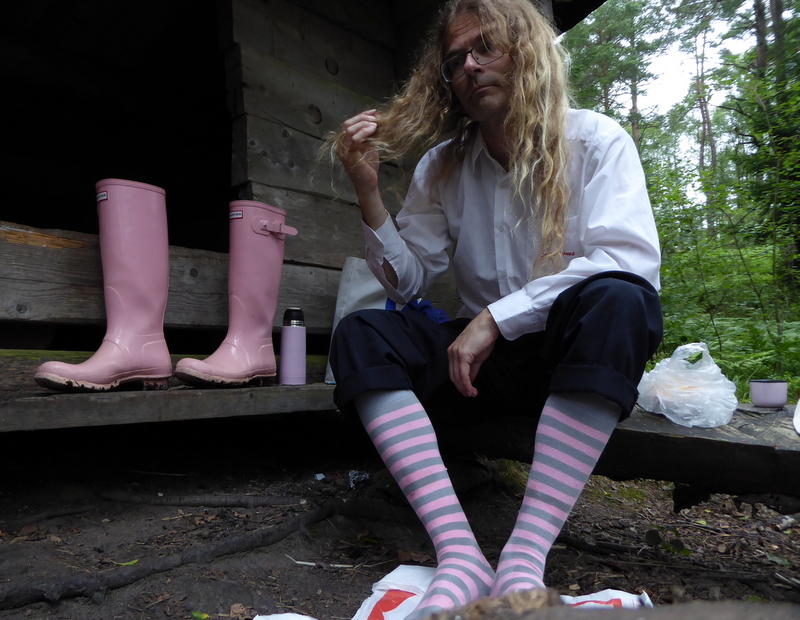 Vid en paus med wienerbröd och kaffe, luftades även stövlarna. Man kan undra ifall en kvinna blir besvärad av att gå runt Kåsjön med en man i skära stövlar? Det får vi väl aldrig veta. Kunde vara kul att göra en sådan sak med någon. Kanske kan det vara omväxlande även för henne, mot att gå på fest varje kväll, dricka alldeles för mycket, och få en skvätt med säd på kläderna från en påstridig pojke i en garderob. Med mig går allt långsammare, och miljoner män återstår ju när hon tröttnat på att gå runt Kåsjön med mig. Sugar-daddy är dessutom mogen och ansvarsfull, har s.k. ordnad (men liten) ekonomi, och två lägenheter (den ena med inneboende, så någon mer får inte plats). Kunde varit en guldgruva för en studentska. Ja, hans studerande syster bodde faktiskt där tidigare, och kan intyga att jag inte tafsar. Fast man vet ju aldrig med en ond ogift man som mig.