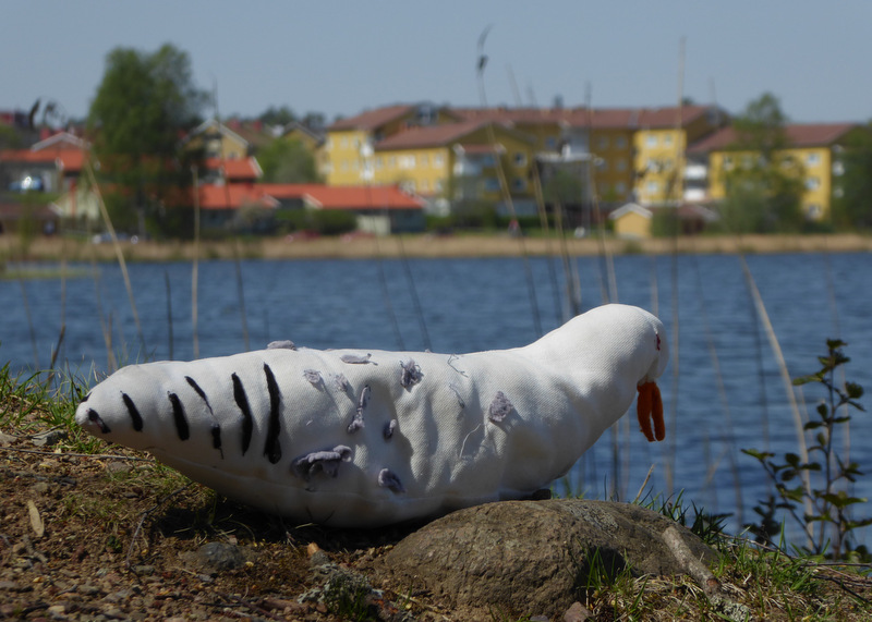 Den här fiskmåsen gjorde jag som kramdjur åt mig själv vid 11 års ålder. Den delar fortfarande säng med mig. Jag somnar faktiskt snabbare då, än utan. Kramdjur rekommenderas även till vuxna - för den som vågar. Nu tog jag med den på semester, vilket jag inte brukar. Bilden togs vid Handskerydssjön i Nässjö.